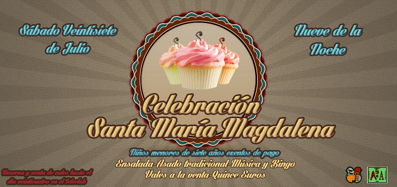 Como viene siendo habitual, para celebrar la próxima festividad de Sta. M. Magdalena, la Asociación Amigos de Alcubilla organiza una cena para el próximo sábado 27 de julio a las 21 h. La cena consistirá en ensalada, el tradicional asado de cordero, postres variados, café y licores. Estará amenizada por Vitaly, «el hombre orquesta». Tras la cena se hará un bingo y se finalizará con baile.El precio de la cena va a ser de 15 €, igual para socios o no socios. Como habitualmente, los tickets de deben comprar o reservar en el bar-teleclub. Los niños menores de 7 años no pagan, pero deben sacar ticket.La fecha límite para adquirir los tickets es el miércoles 24 de julio. El cartel que se ha preparado para este evento lo podéis bajar de aquí.