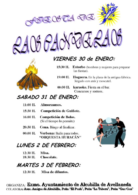 Ya disponemos del programa oficial de la Fiesta de Las Candelas. Aquí podéis ver el cartel. El que tenga intención de asistir a la cena del sábado 31 de enero debe apuntarse en la lista que hay colocada en el bar ala mayor brevedad posible. También se puede llamar al Bar para hacer reserva al telefono 975357681.
