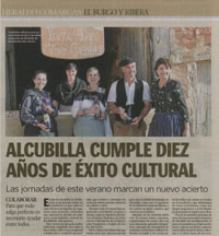 | 27-5-2011 | Alcubilla en la prensa Nos ha llegado el artículo que el Heraldo de Soria dedicó a nuestro pueblo y a las actividades que se desarrollaron la pasada Semana Santa. El artículo se publicó el día 6-5-2011. Aunque la Semana Santa ya está lejos, lo podéis ver aquí. |