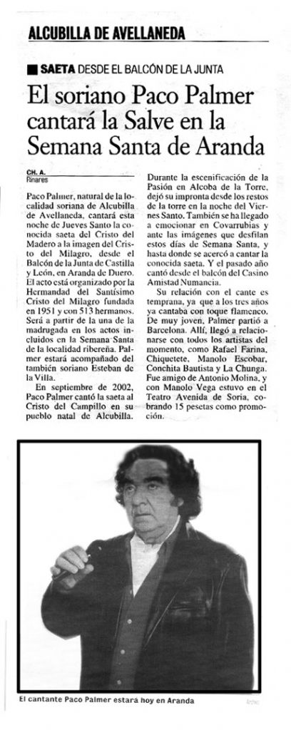 Paco Palmer hijo de Alcubilla cantó la noche de Jueves Santo la saeta del Cristo del Madero, desde el balcón de la Junta de Castilla y León de Aranda de Duero. Puedes ver el artìculo completo aparecido en el Diario de Soria el día 8 de abril del 2004.